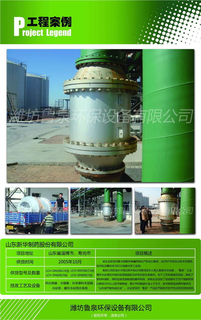 集團(tuán)公司在設(shè)計(jì)方案過程中經(jīng)過與我司技術(shù)人員認(rèn)真探討與溝通,“魯泉”工業(yè)循環(huán)水處理技術(shù)成功運(yùn)用到園區(qū)內(nèi)所有給排水系統(tǒng)中。生產(chǎn)工藝和裝備的 改進(jìn),降低了原材料消耗,同時(shí)促進(jìn)資源能源的循環(huán)利用。協(xié)助企業(yè)創(chuàng)造了連續(xù)數(shù)年萬元產(chǎn)值能耗同比降低10%以上的節(jié)能奇跡,累計(jì)節(jié)約能源價(jià)值上千萬元,新 華制藥連續(xù)兩年被評(píng)為“山東省節(jié)能先進(jìn)企業(yè)”。企業(yè)領(lǐng)導(dǎo)對(duì)“魯泉”產(chǎn)品及節(jié)能技術(shù)給予充分的支持和肯定。