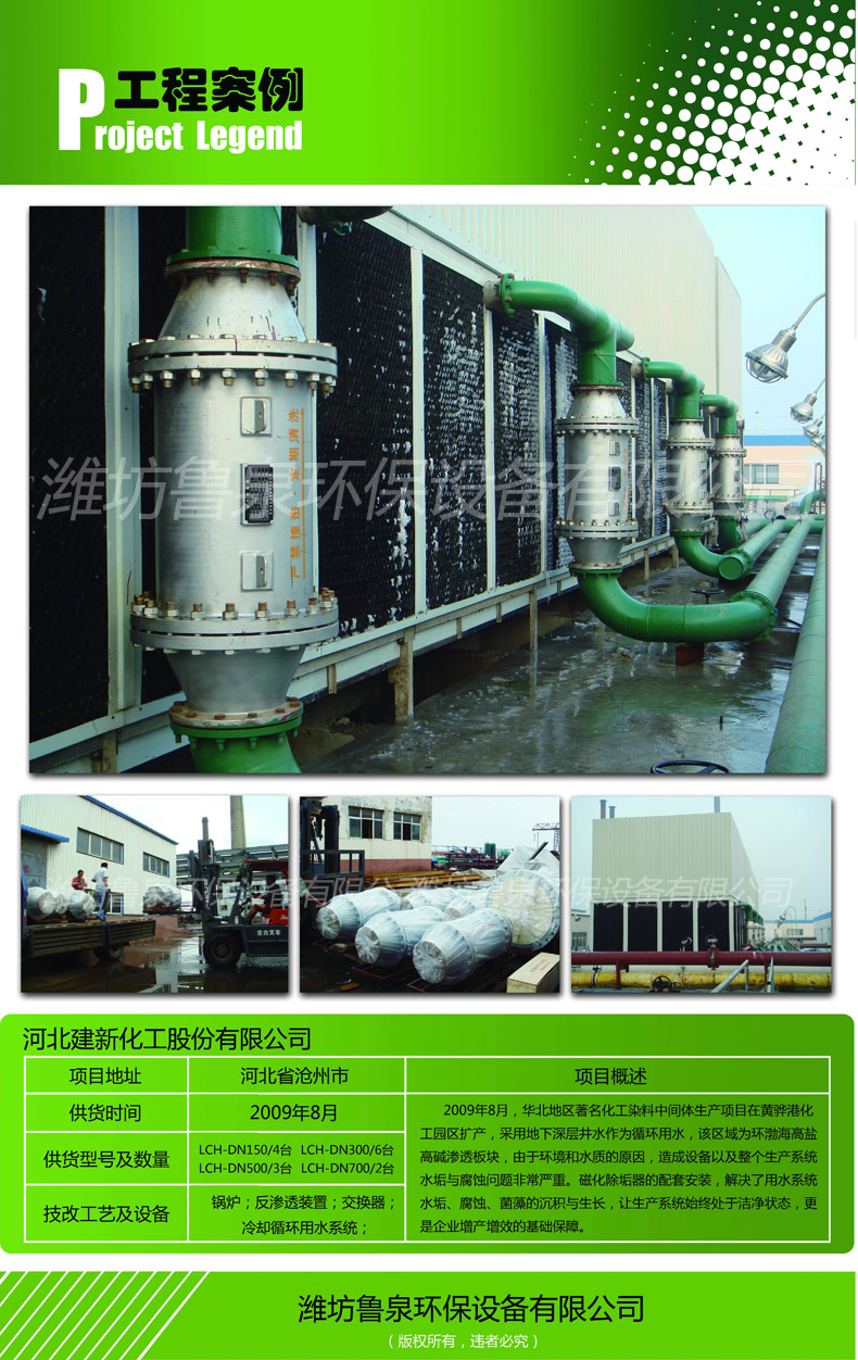 2009年8月,華北地區(qū)著名化工染料中間體生產(chǎn)項(xiàng)目在黃驊港化工園區(qū)擴(kuò)產(chǎn),采用地下深層井水作為循環(huán)用水,該區(qū)域?yàn)榄h(huán)渤海高鹽高堿滲透板塊,由于環(huán)境和水質(zhì)的原因,造成設(shè)備以及整個(gè)生產(chǎn)系統(tǒng)水垢與腐蝕問題非常嚴(yán)重。磁化除垢器的配套安裝,解決了用水系統(tǒng)水垢、腐蝕、菌藻的沉積與生長,讓生產(chǎn)系統(tǒng)始終處于潔凈狀態(tài),更是企業(yè)增產(chǎn)增效的基礎(chǔ)保障。