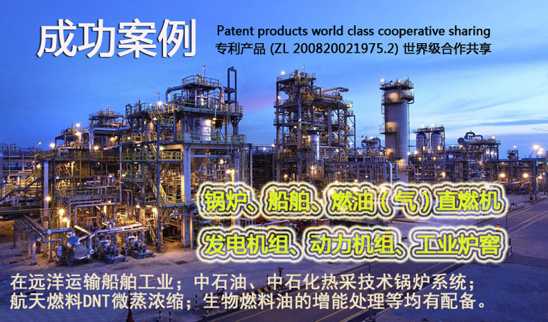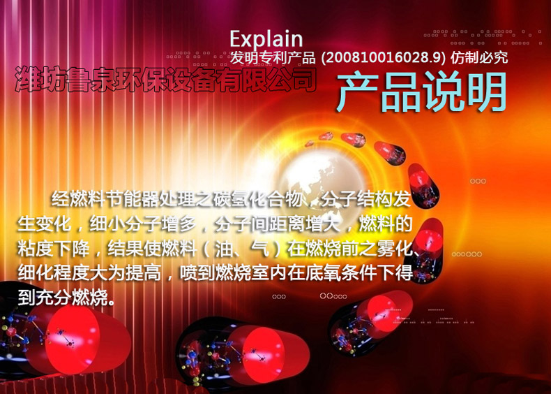 經(jīng)燃料節(jié)能器處理之碳氫化合物,分子結(jié)構(gòu)發(fā)生變化,細小分子增多,分子間距離增大,燃料的粘度下降,結(jié)果使燃料(油、氣)在燃燒前之霧化、細化程度大為提 高,噴到燃燒室內(nèi)在底氧條件下得到充分燃燒,因而燃燒設(shè)備之鼓風(fēng)量可以減少百分之15至百分之20,避免煙道中帶走之熱量,煙道溫度下降百分之30左右。 節(jié)省了燃料,保護了廢氣對環(huán)境的污染。